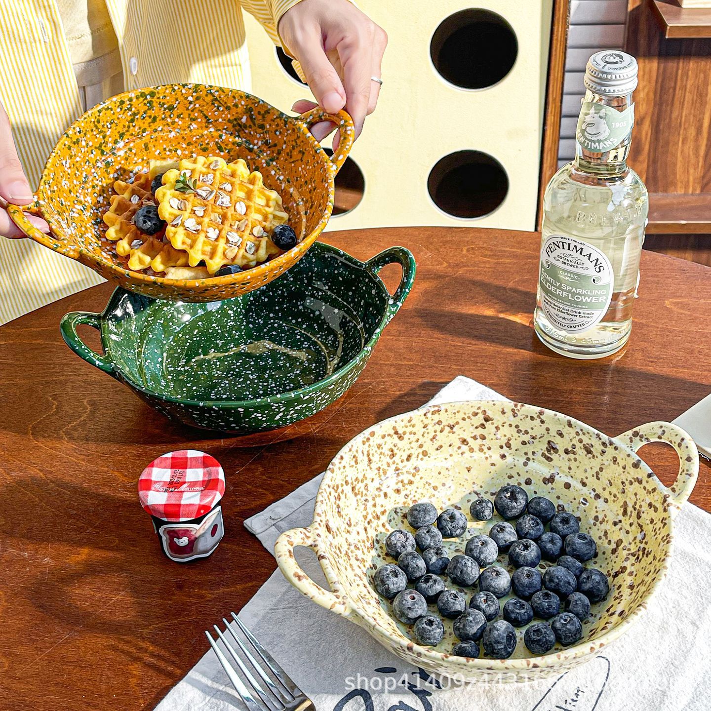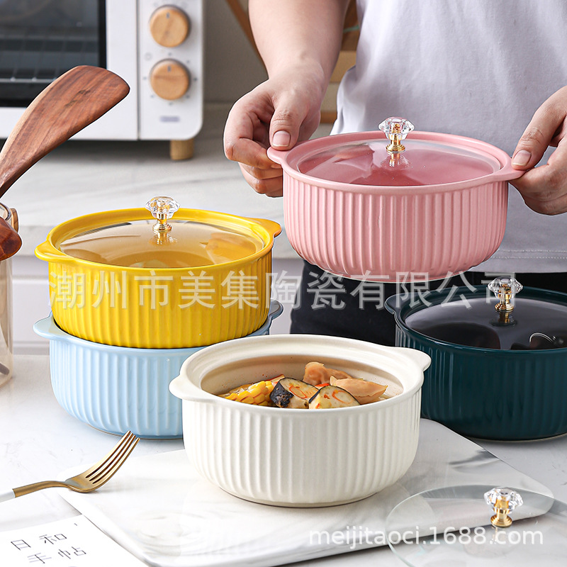 丸型インス風蓋付き両耳麺鉢、蓋付き家庭用・業務用食器、ネットで話題の潮州色釉陶器スープ鉢