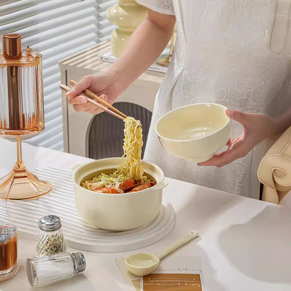 クリーム風陶磁器カップラーメン碗蓋付き学生寮用ヨーグルト碗かわいい食器碗箸セットインスタントラーメン碗