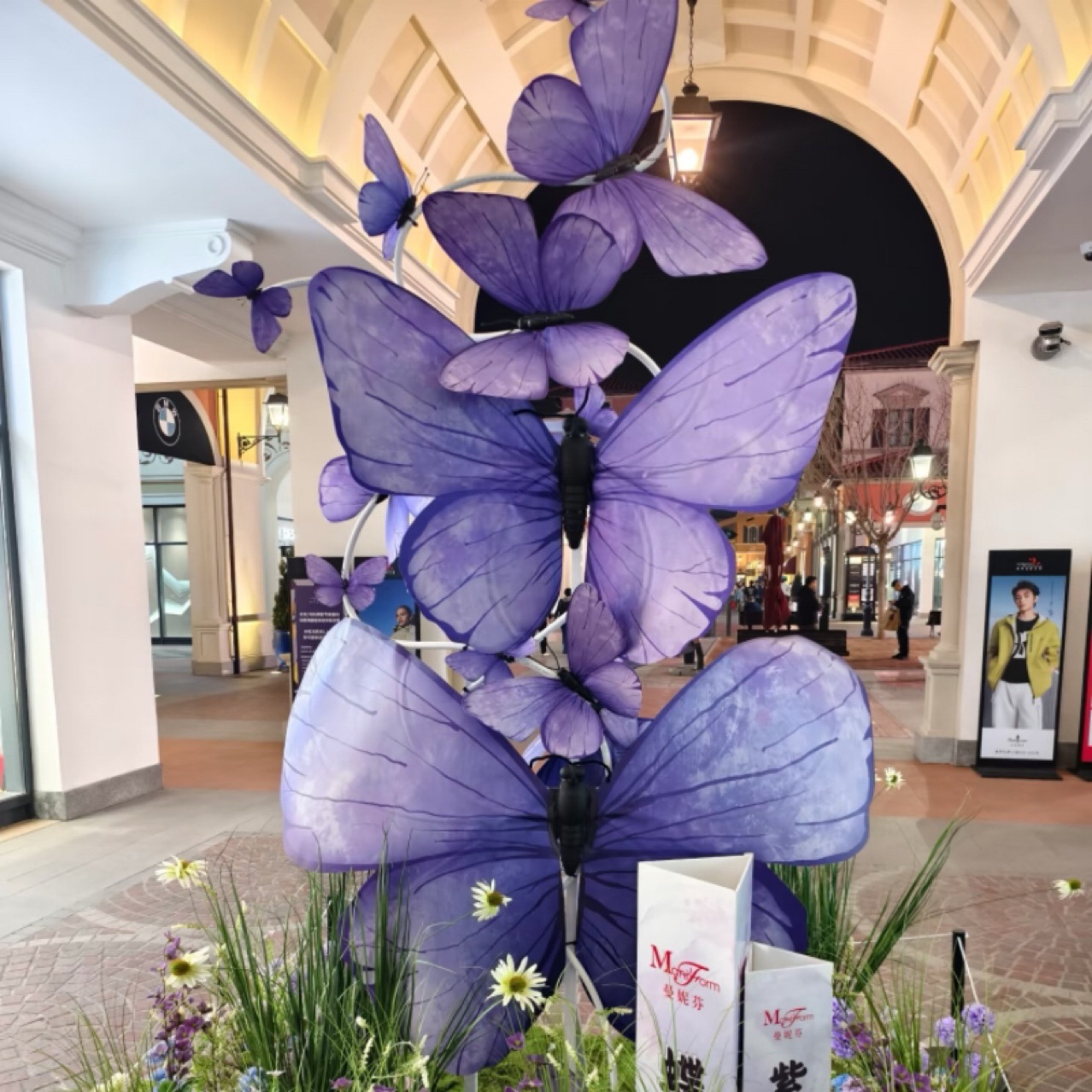 大型蝶装飾デパートの美陳dp点をシミュレートして紫色の蝶道具を飾ってショーウインドーのシーンを飾る