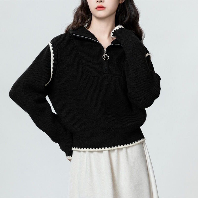 韓国刺繍パターンハーフジップラペルプルオーバーセーター女性のための秋と冬の新しいルーズで多用途なセータートップ
