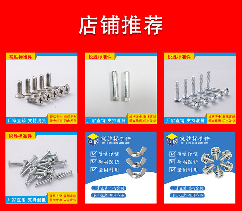 製品仕様 M3 * 9(平頭メッキカラー),M4 * 11(平頭メッキカラー),M 5*13(平頭メッキカラー),M 6*15(平頭メッキカラー),M 8*18(平頭メッキカラー),M10 * 21(平頭メッキカラー),M 12*22(平頭メッキカラー),その他