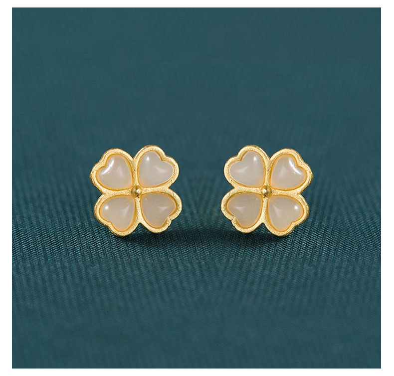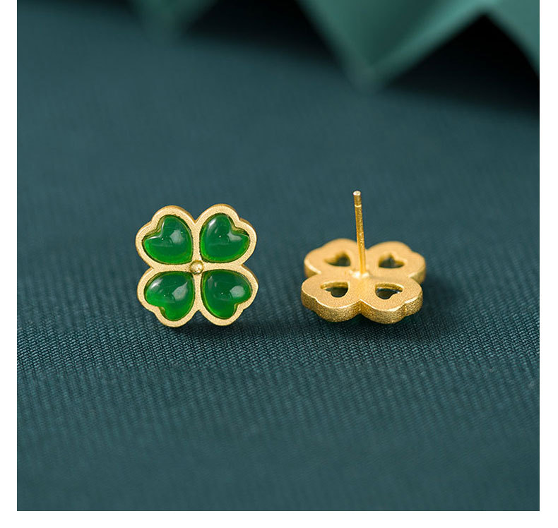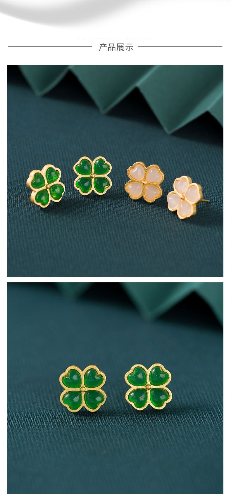 レトロファッション、軽やかな高級感、模造和田碧玉の四つ葉のクローバーイヤリング、女性用、S925シルバーピン、シンプルでエレガントなイヤリング