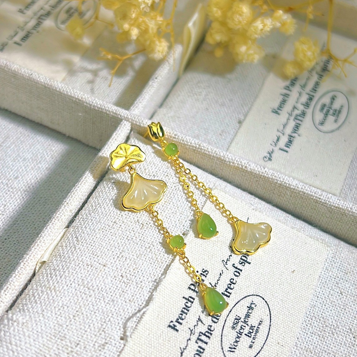 天然和田玉銀杏の葉のデザインの長いタイプの純銀の女性の金メッキのイヤリングの小さい大衆の気質のファッションの百合の耳飾り