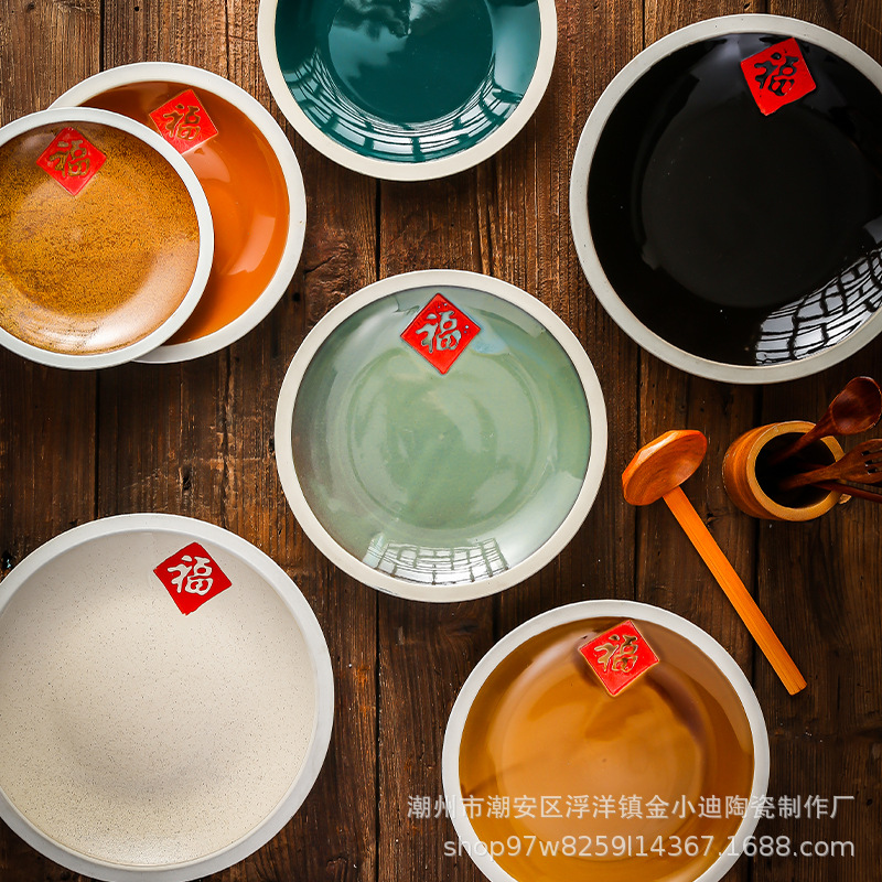 シンプルな陶磁器の9.5寸の平辺の浅い福の皿のレストランの古いレトロなアイデアの皿の中国式の皿の料理の皿