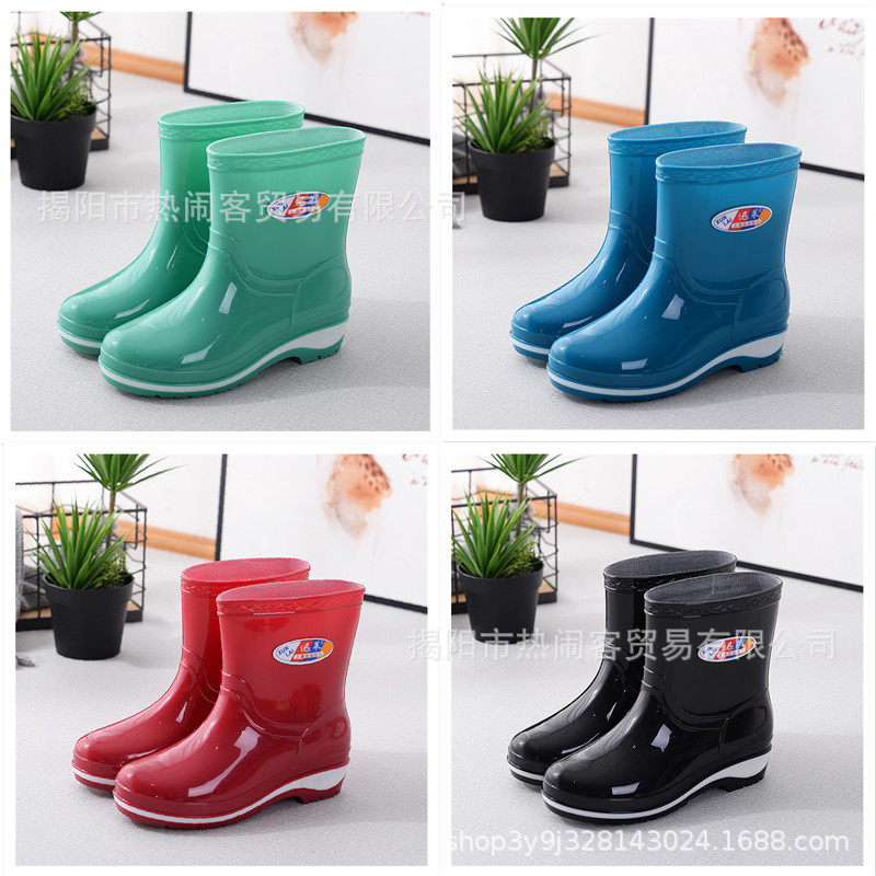 夏の中筒ファッション女性雨靴田園滑り止めゴム靴厨房母靴労働保護女性水靴カバー足雨靴女