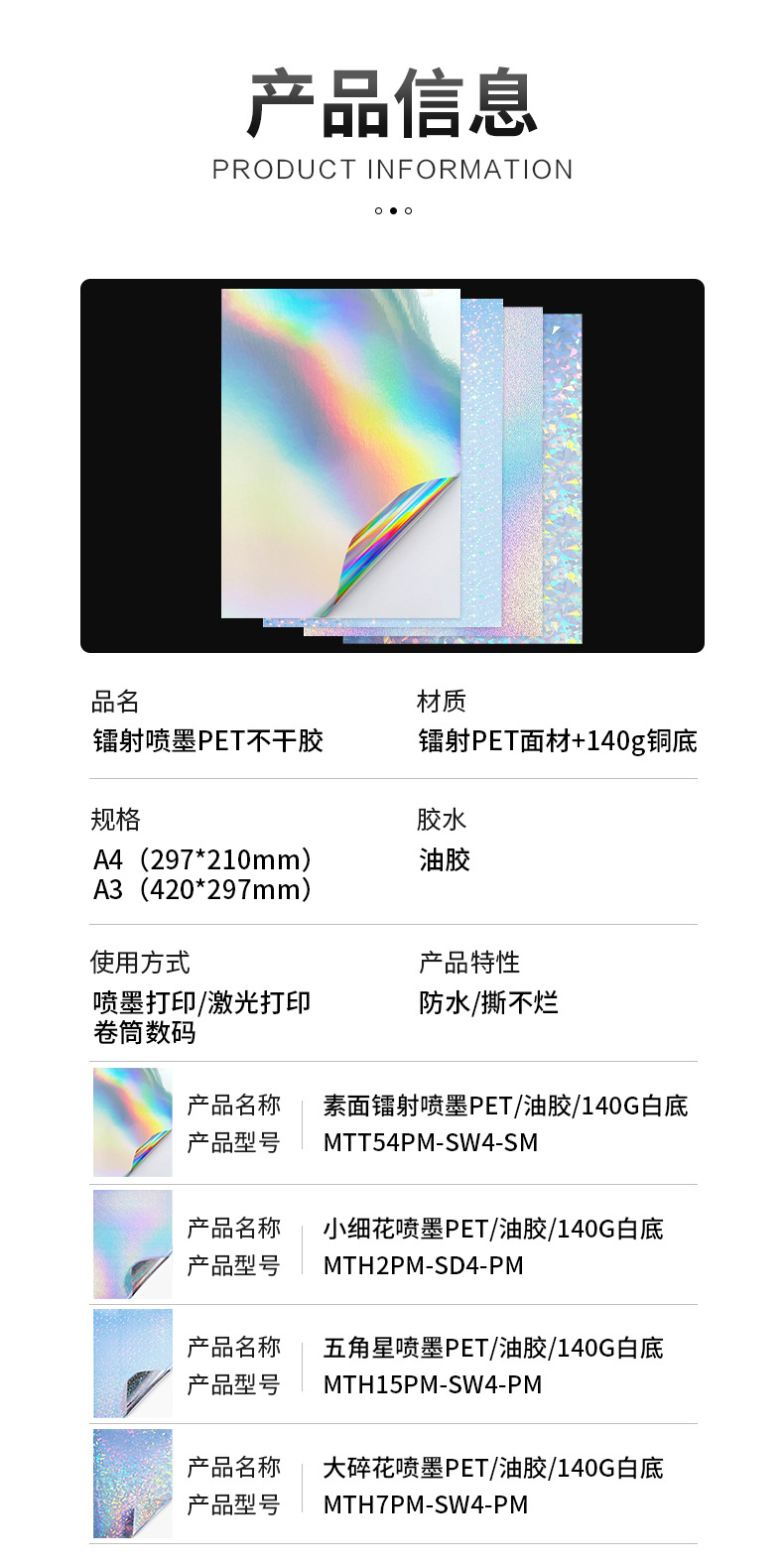 仕様とモデル プレーンレーザーインクジェットPET/油性接着剤/140G白地;A4(210*297MM),小花インクジェットPET/油性接着剤/140G白地;A4(210*297MM),ライススターインクジェットPET/油性接着剤/140G白背景;A4(210*297MM),大花インクジェットPET/油性接着剤/140G白地、A4(210*297MM)