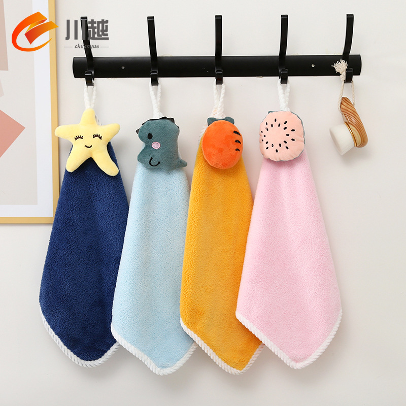 かわいい漫画柄の手拭きタオル、コーラルベルベット、子供用吊り下げ式スクエアタオル、家庭用吸水速乾キッチン掃除用小タオル