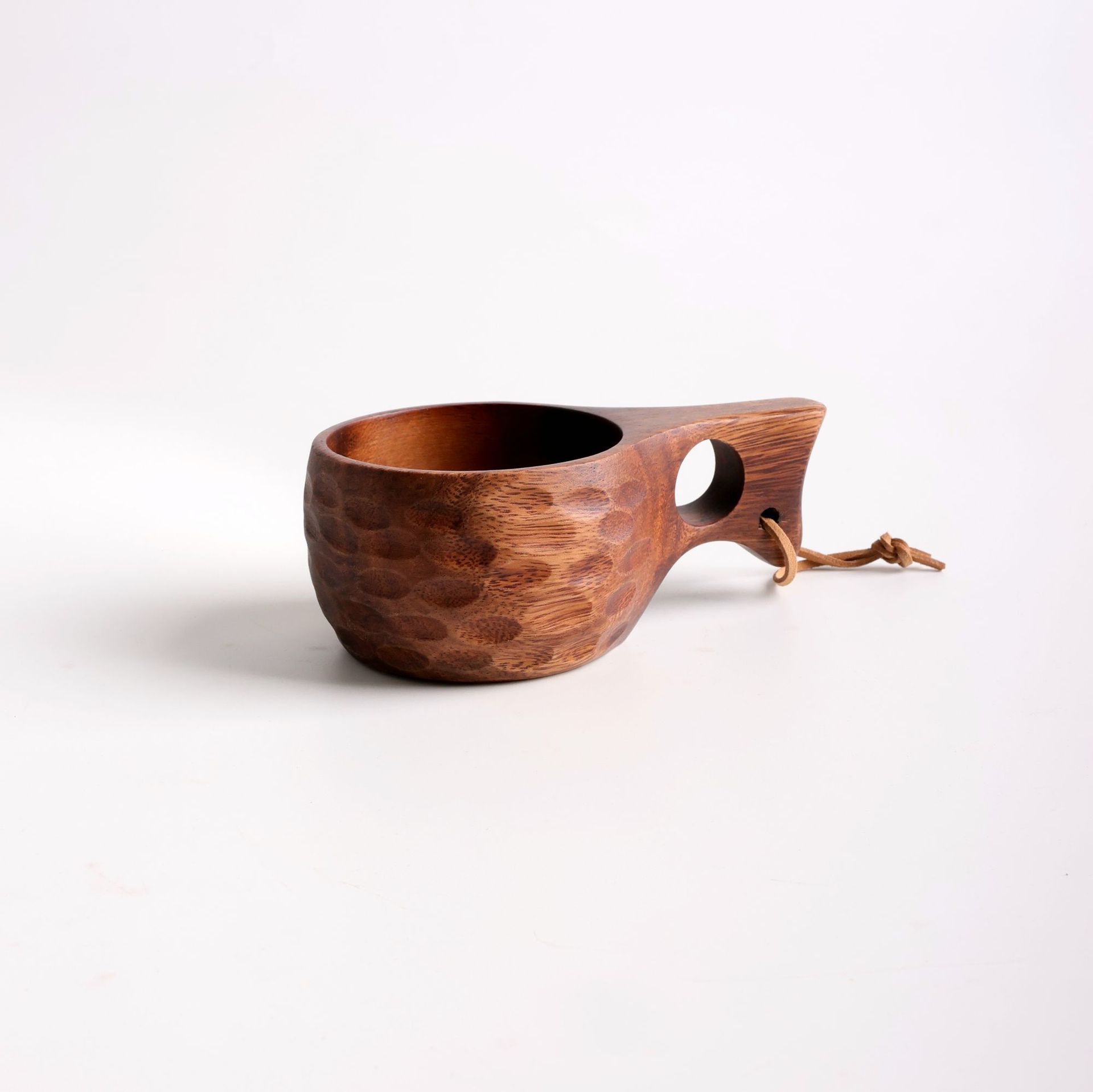 ケヤキのコップはハンドル付きで、ミルクカップのコーヒーカップの木製北欧フィンランドカップの屋外キャンプカップです。