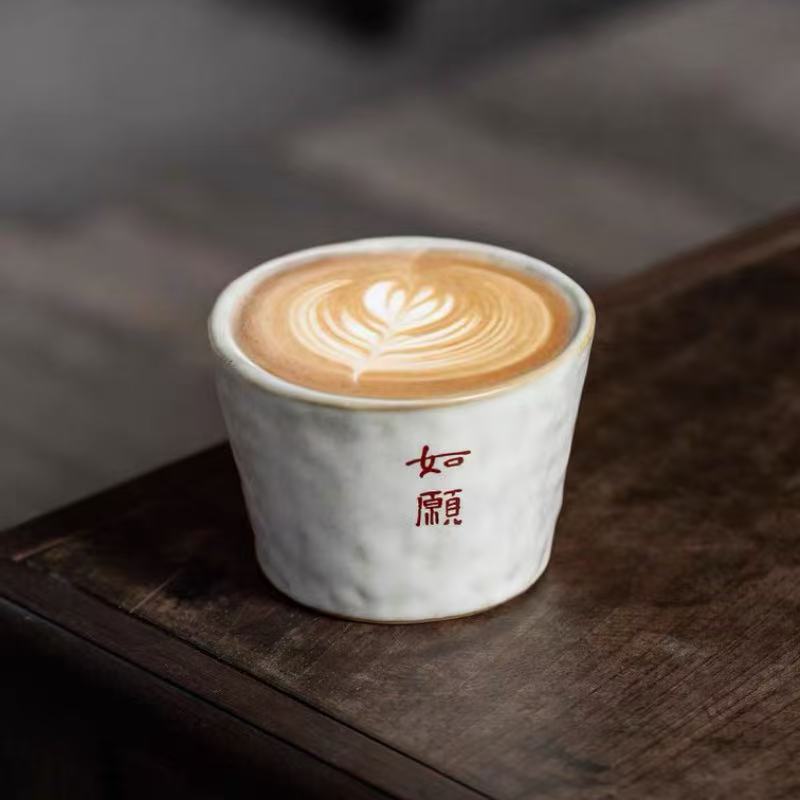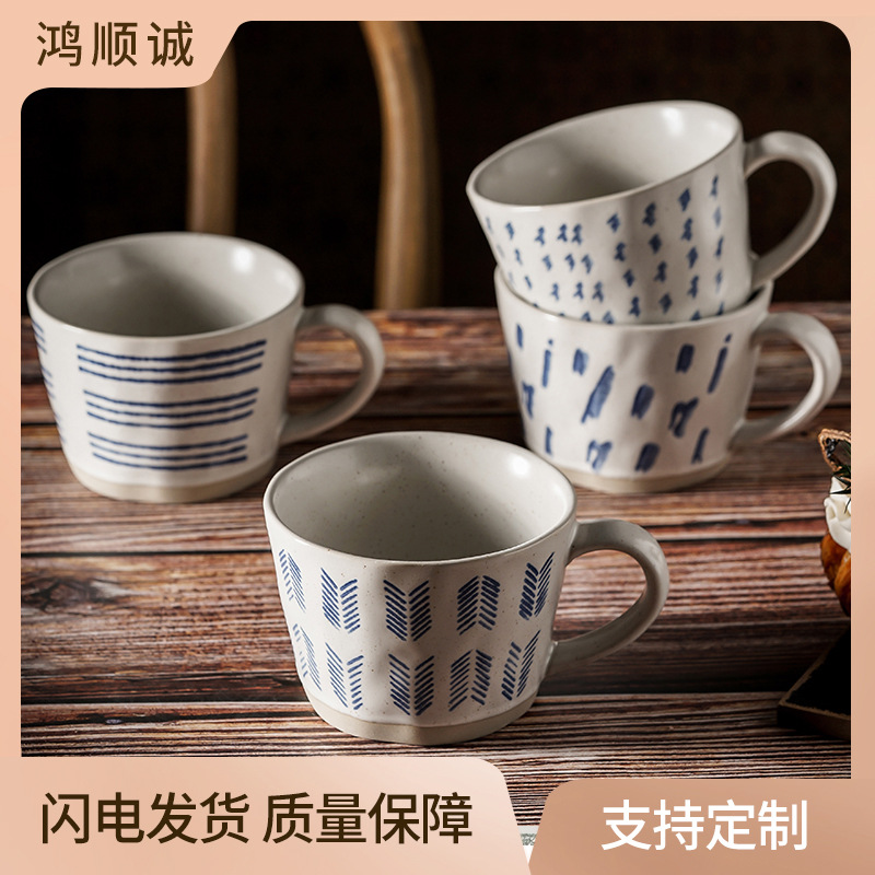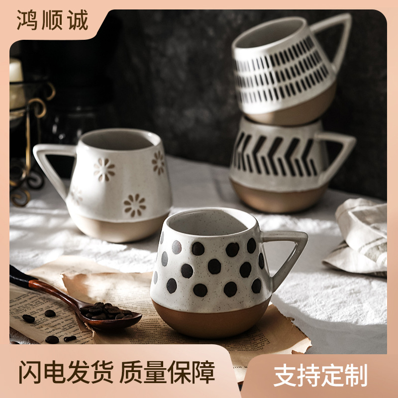 日式复古陶瓷杯创意图案咖啡杯拿铁拉花杯家用燕麦杯粗陶花边杯子