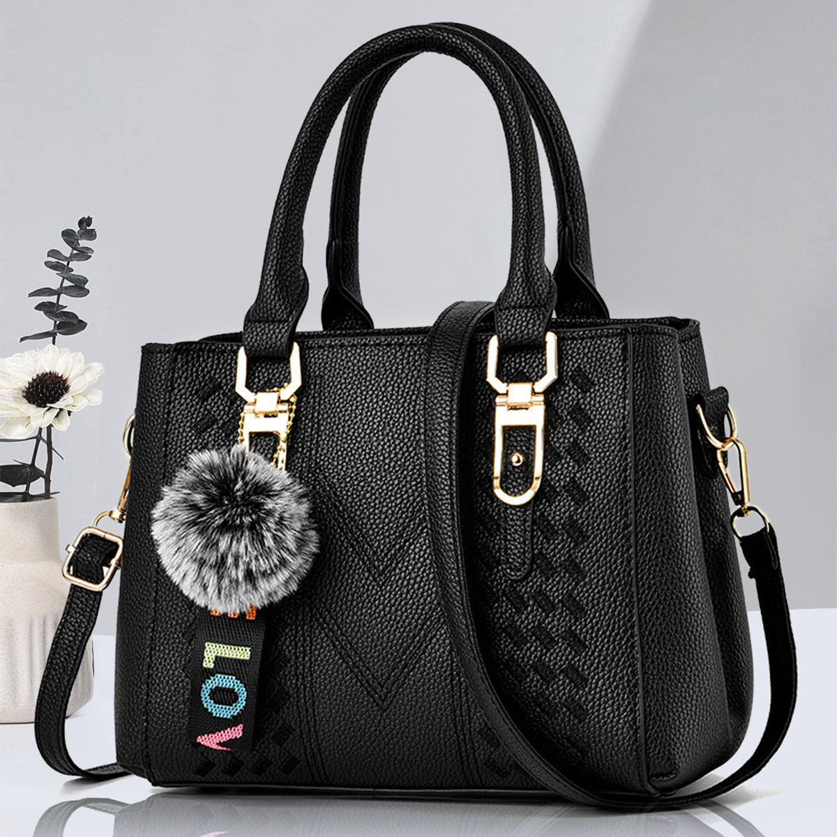 包包女2025新款潮欧美手提包毛球挂件简约单肩斜挎包女士包袋