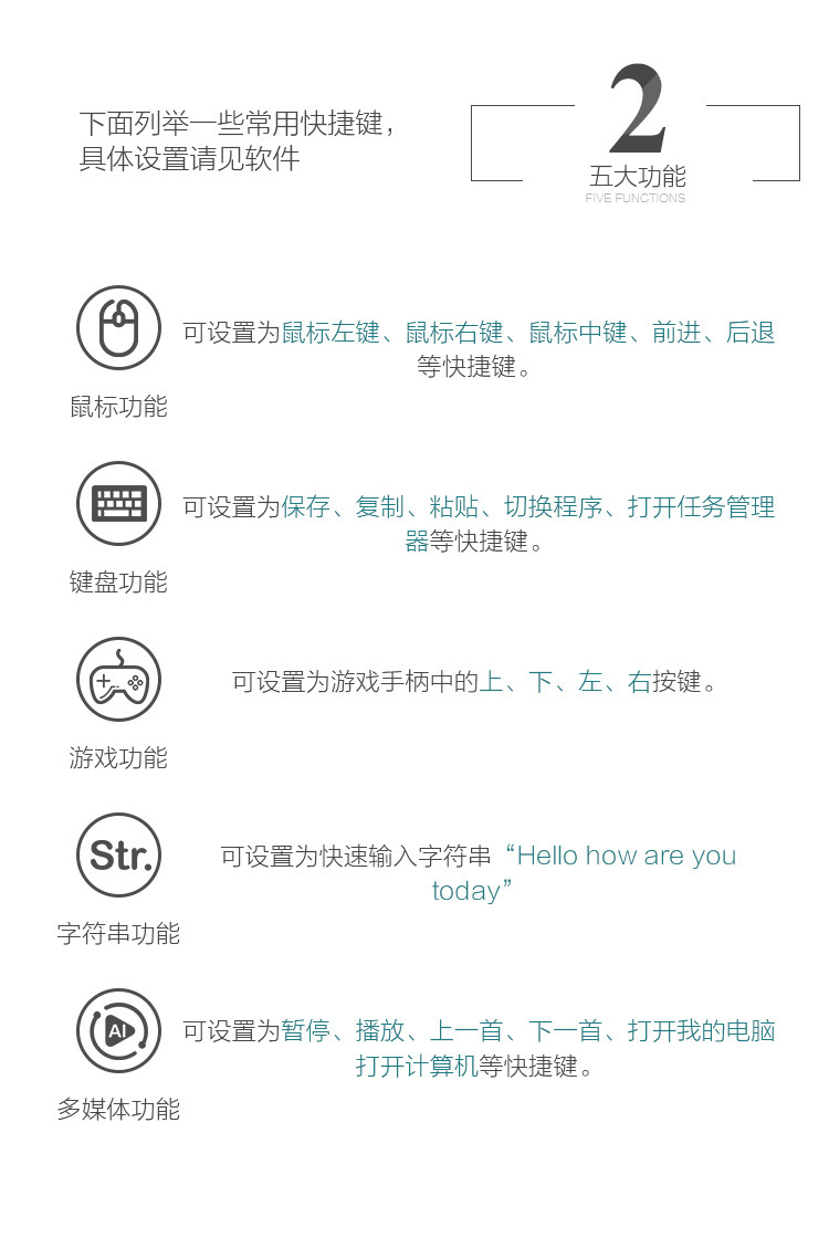 1.键盘功能:可以设置为任意键值或组合键,例如设为键值A或者CTRL+A。