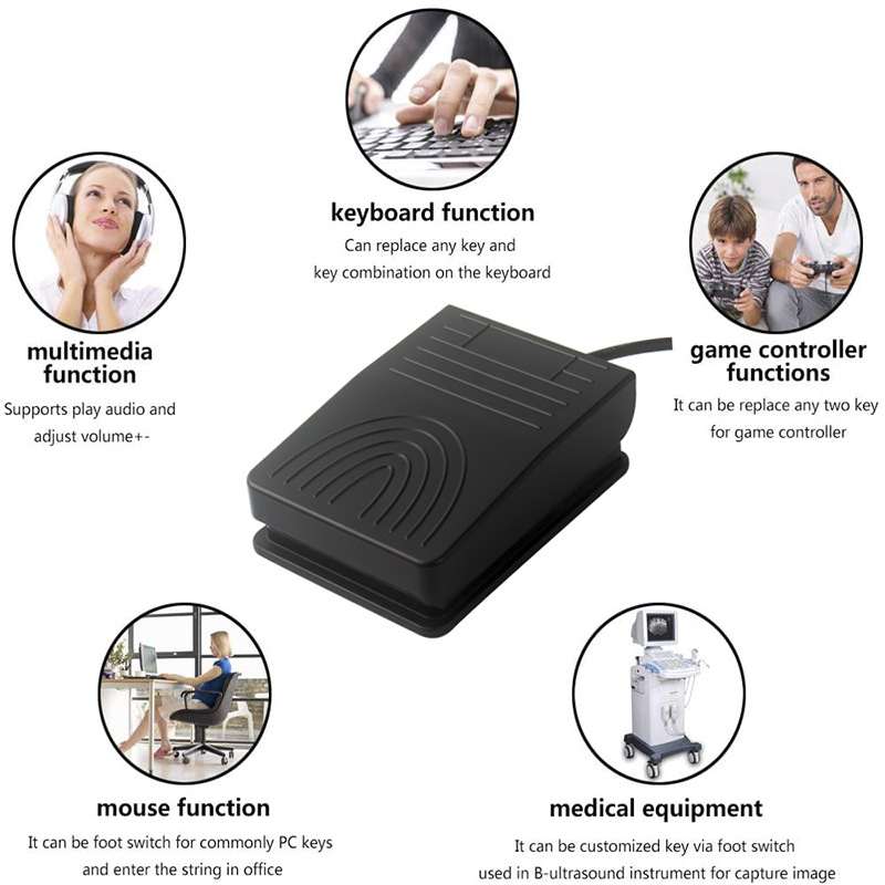 USB脚踏开关相当于一个拥有一个按键的标准USB键盘和鼠标,按键可以通过配套软件”FootSwitch”设置键盘,鼠标和游戏手柄的键值保存在设备中,除此外软件还有多媒体功能、字符串打印功能,通过这两个功能可以实现更加方便快捷的操作,设备使用过程无需其他软件。