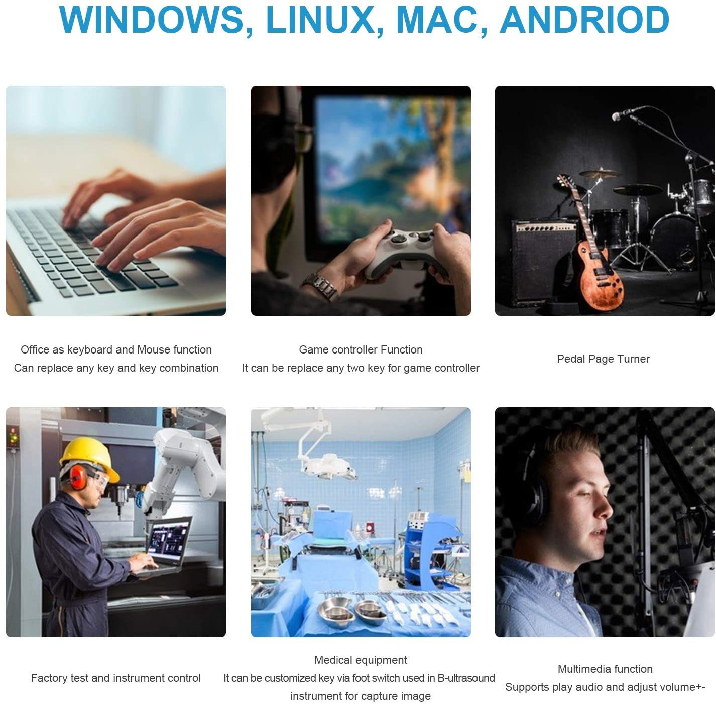 提供基于Windows系统的按键定义设置软件”FootSwitch”,设置完成后用户可用于以下系统:Dos、Windows All、Linux、Mac、Android.