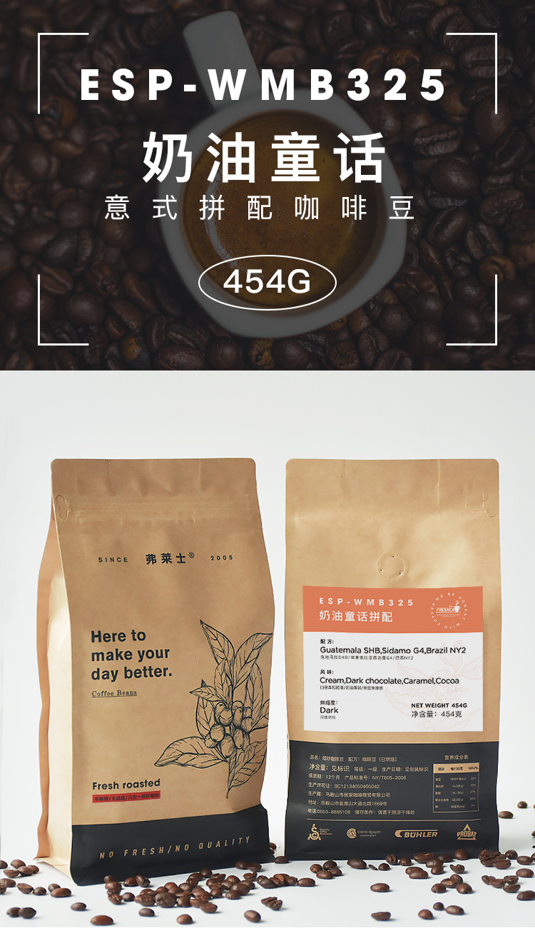 フレズコーヒー豆卸売りはカフェの甘み感の高いコクのあるクリーム童話にコーヒー豆454gを配合している