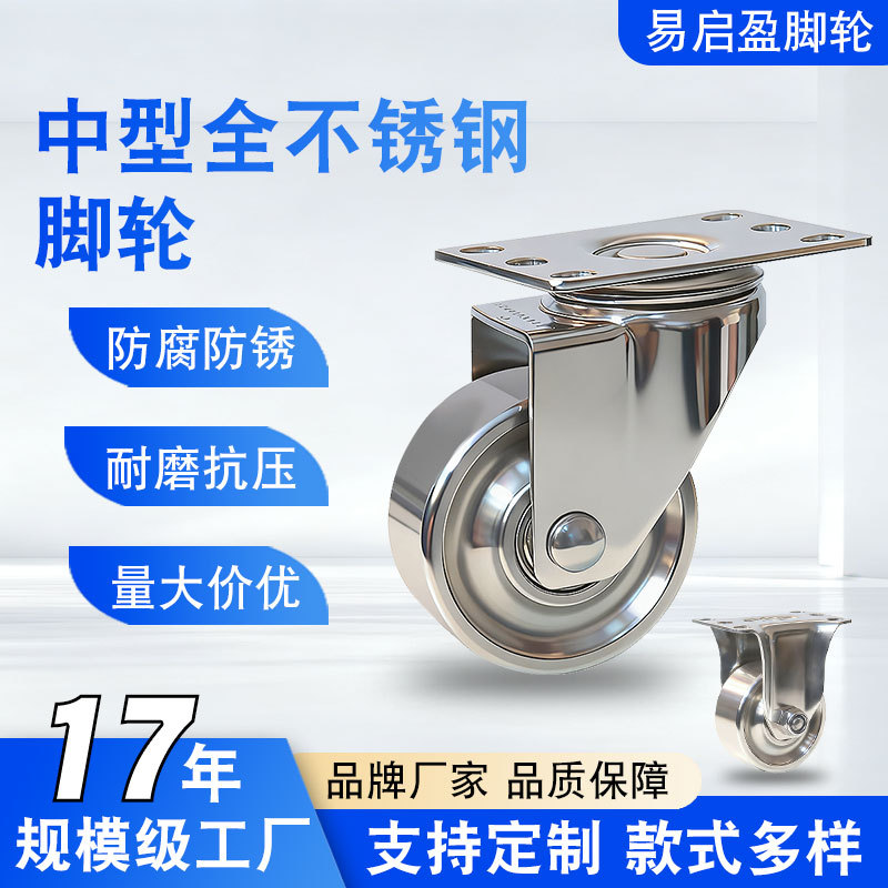 304全不锈钢中型耐磨脚轮3寸4寸5寸防腐蚀耐高温实芯万向轮刹车