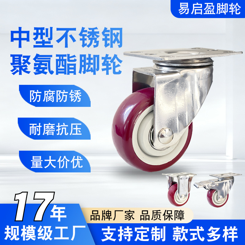 304中型不锈钢枣红聚氨酯脚轮2.5寸3寸4寸5寸平底款万向轮带刹车