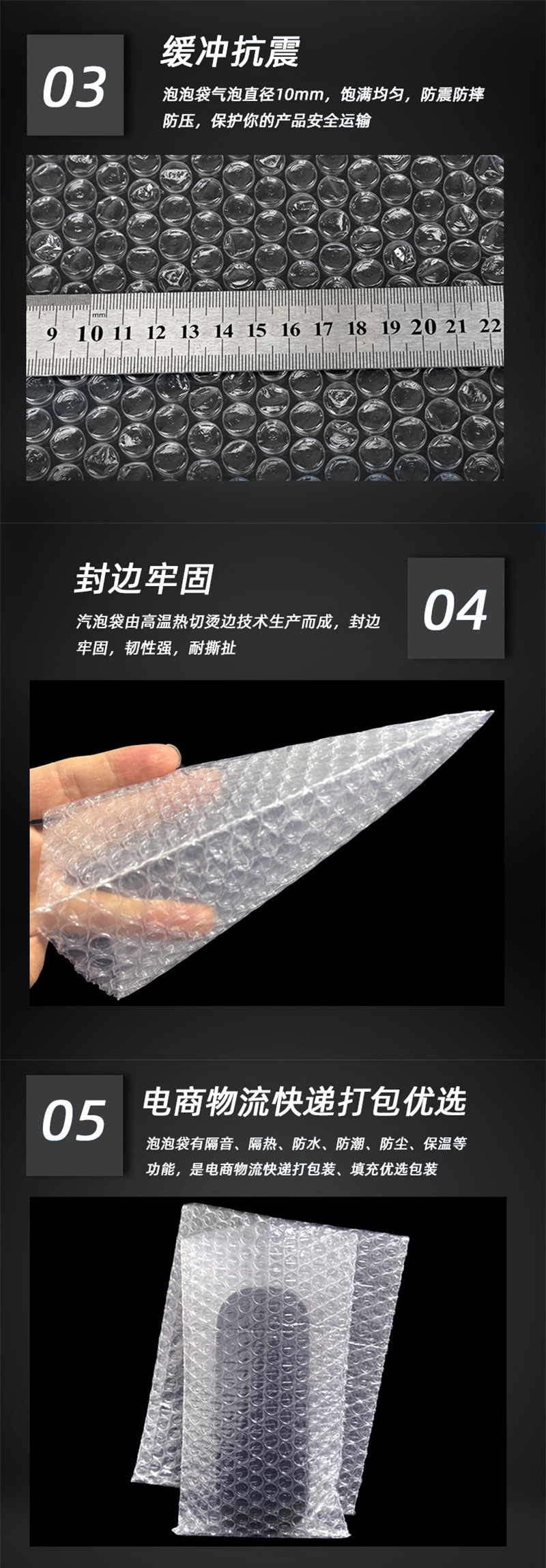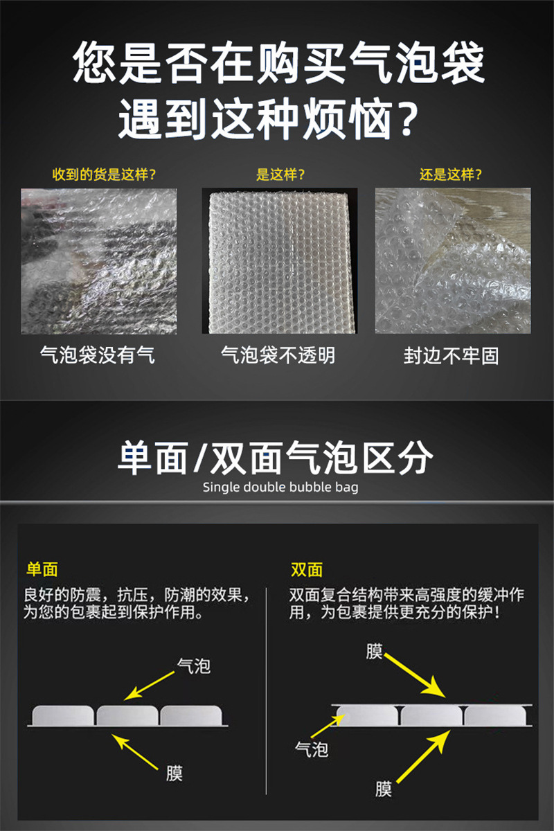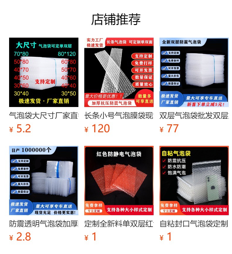 本店的气泡袋均采用全新料,气泡饱满,防震性好,能有效的防护产品在运输过程中受损,已避免造成您不必要的损失,与此同时,本店气泡袋均支持定制,能有效满足您的各种需求,如有需要请及时联系客服。本店有多种快递、物流,能有效保证您的货物及时送达。