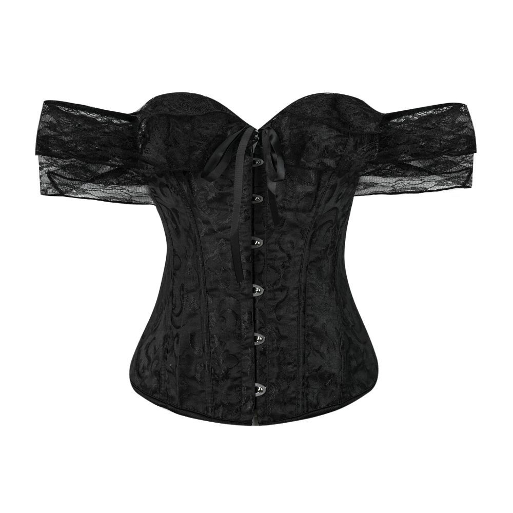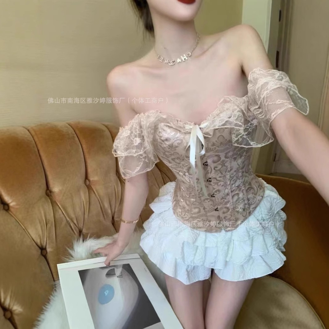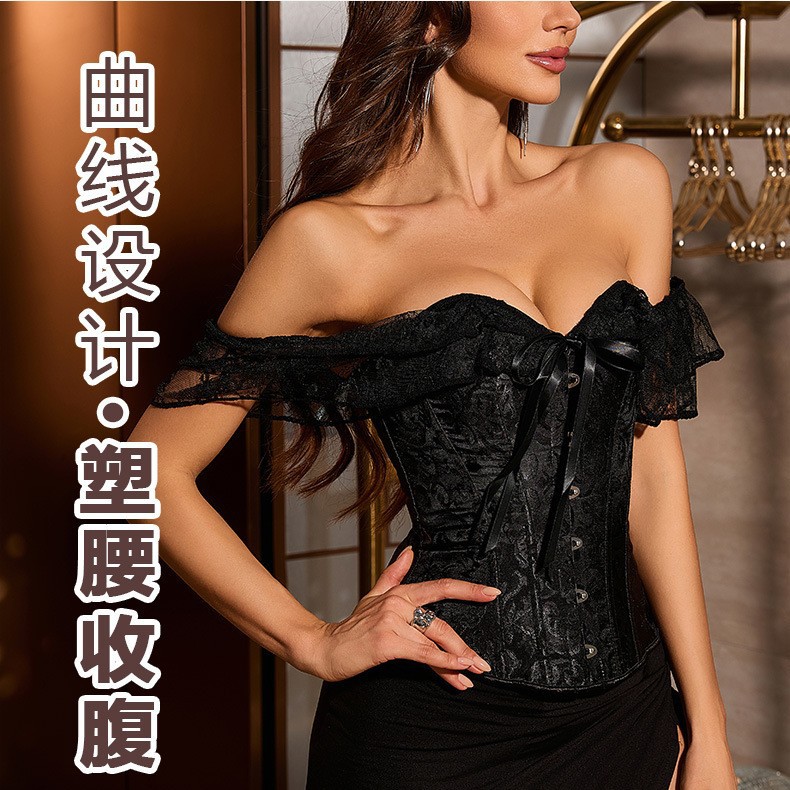 corset新款复古蕾丝花边鱼骨塑身上衣一字肩带泡泡袖聚拢托胸骨衣