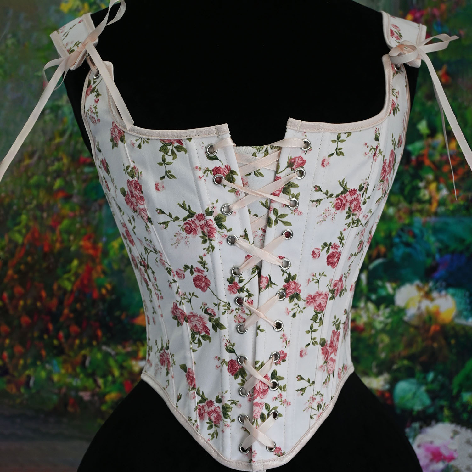 3057 ピンクのフレッシュフレンチレトロ胸巻きコートコルセット前後ストラップ付きUネック小バラプリントベスト