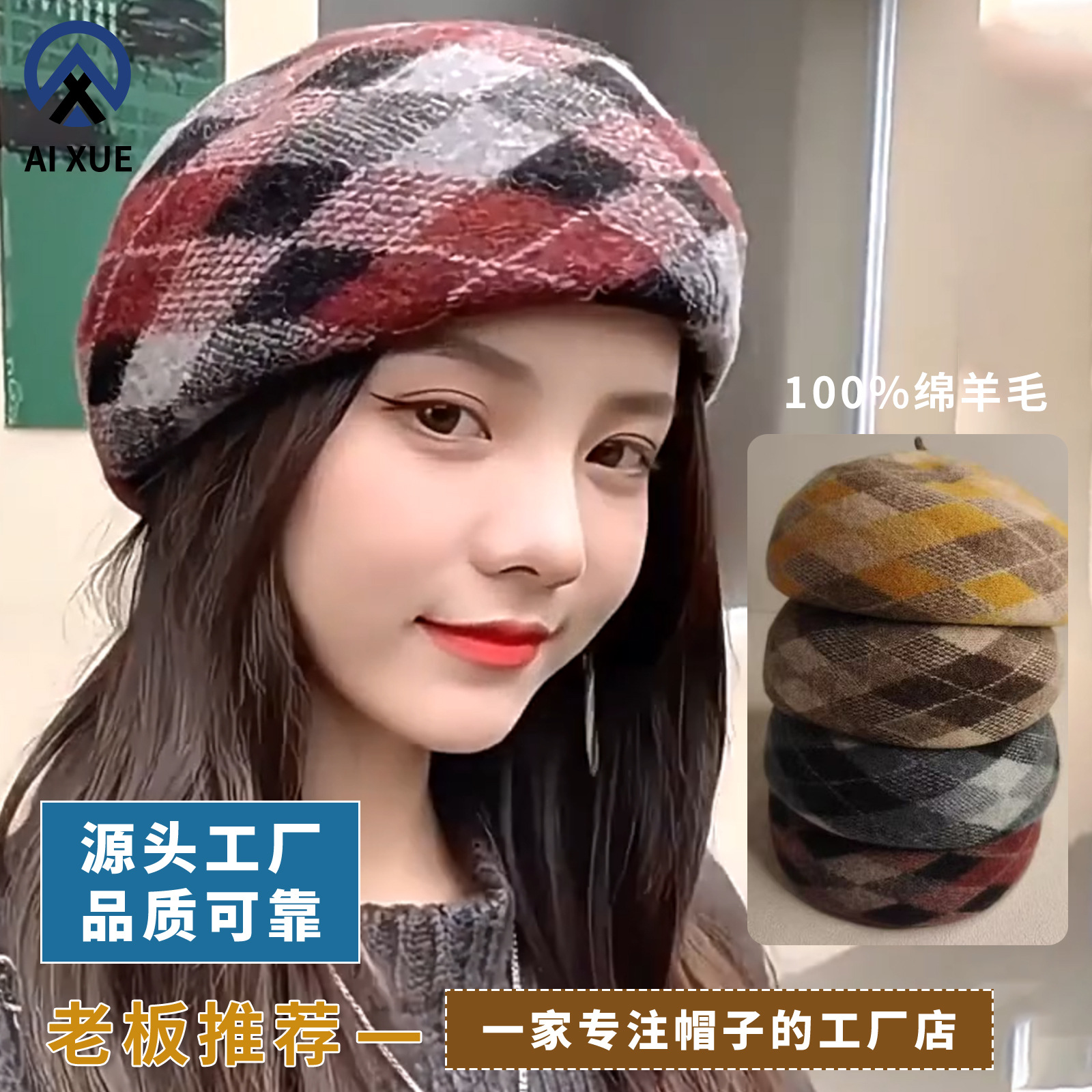 2025年新作高級ベレー帽 秋冬 韓国風画家帽 100%ウール帽子 ジャカード格子柄 保温パンプキンハット