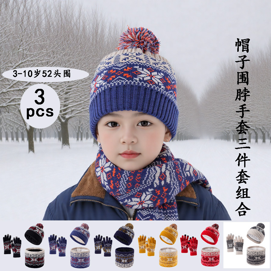 クロスボーダーベルベットネックプロテクター子供用ニット帽子スカーフ手袋新しい暖かい子供用スノーフレークスリーピースセット