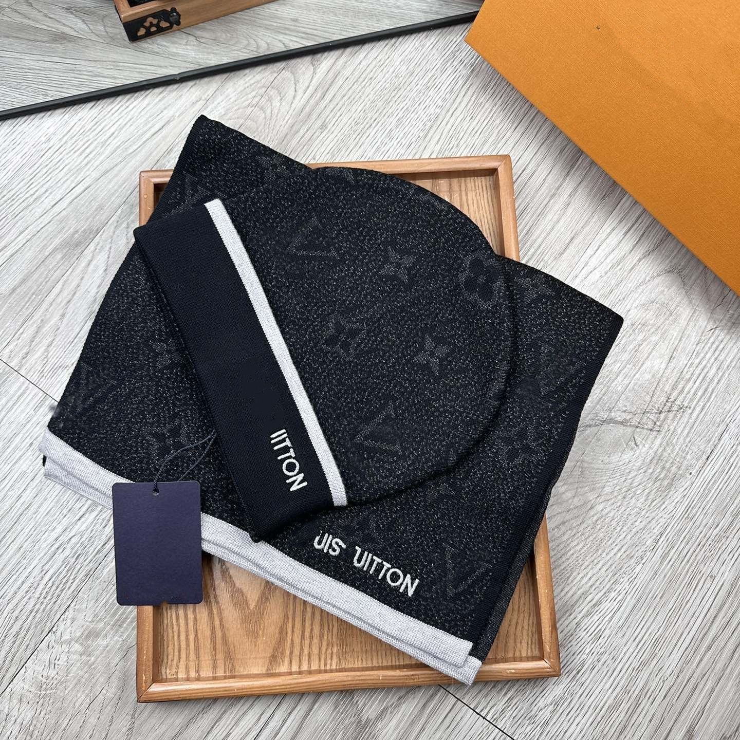 V字母刺绣欧美风围巾帽子两件套装针织男士羊毛皮标围巾棋格子