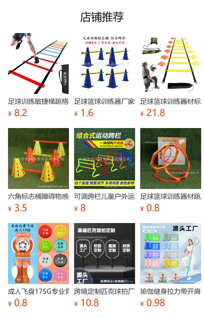 产品种类丰富,主要生产足球篮球训练用品,瑜伽健身运动器材,足球门,口哨,护腿板,户外运动飞盘及匹克球拍等系列产品;