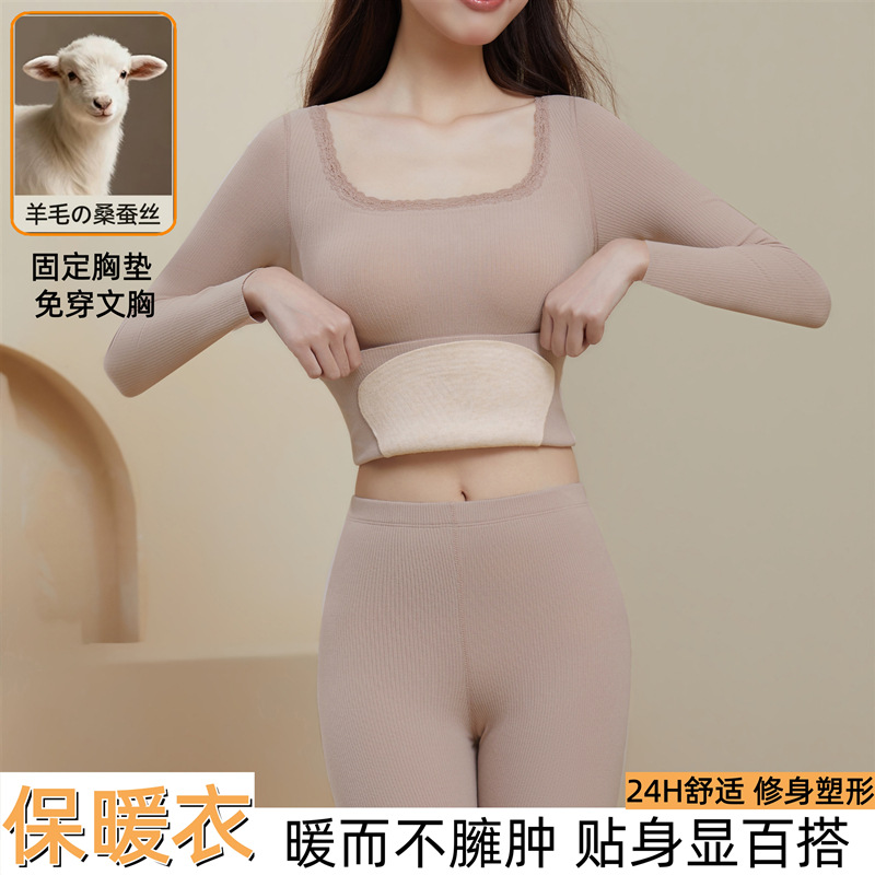 高品质秋冬季保暖内衣套装带胸垫加绒羊毛蚕丝秋衣秋裤打底衣女款