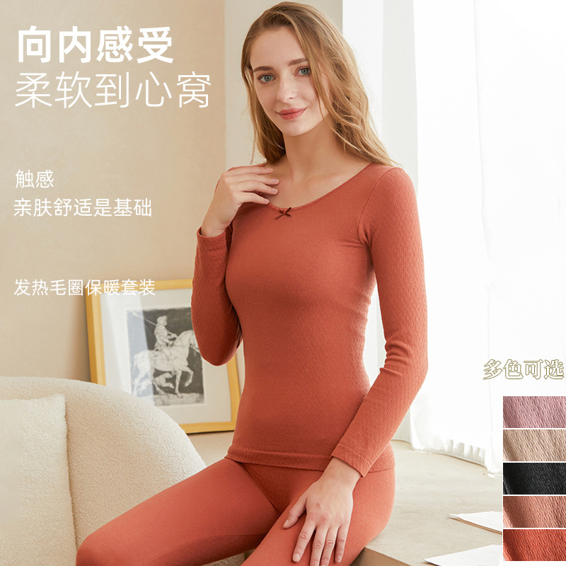 2025秋冬新作 丸首リボン付きテリーフリース保温下着 レディースセット 発熱秋服秋パンツ卸売