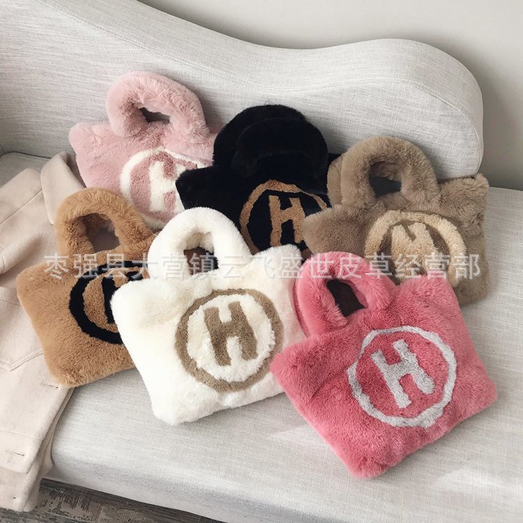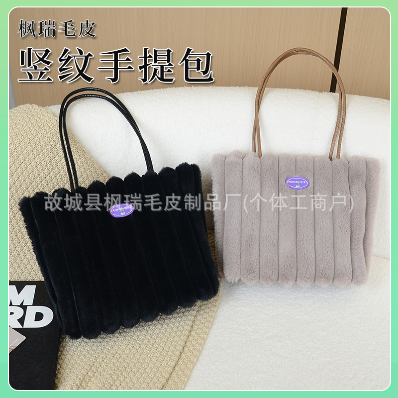 新款条纹牌牌毛绒包大容量女士单肩手提包时尚少女通休闲托特包