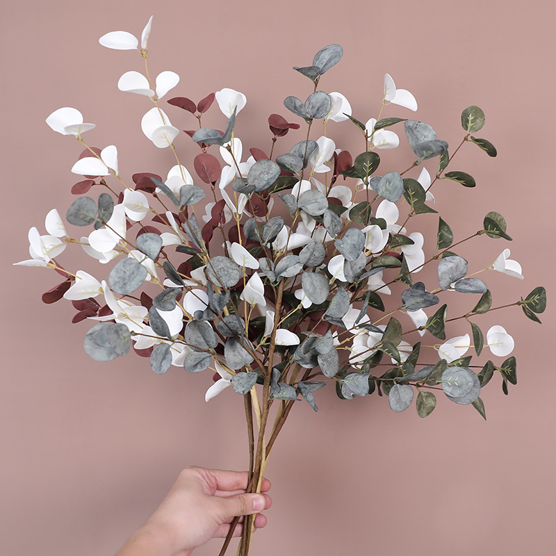 模擬ユーカリの葉、緑の植物、ホームフラワーアレンジメント、人工シングル模擬花、結婚式のシーンのレイアウト、撮影小道具、花