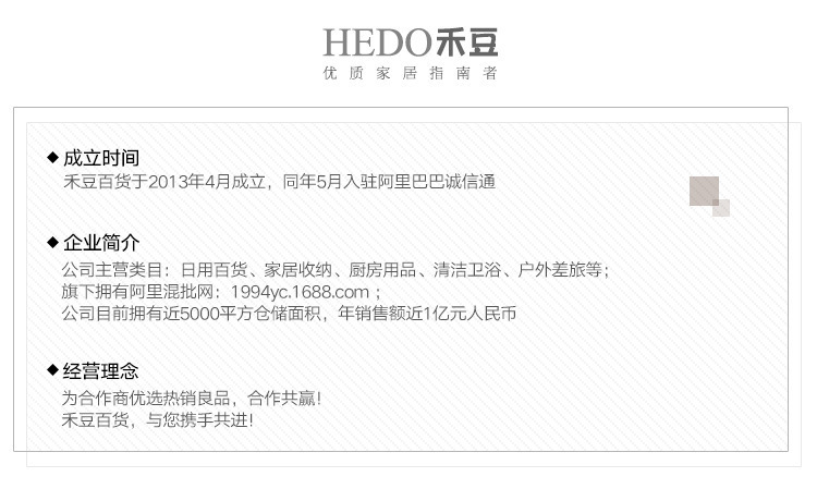 禾豆百货于2013年4月成立,同年5月入驻阿里巴巴诚信通。