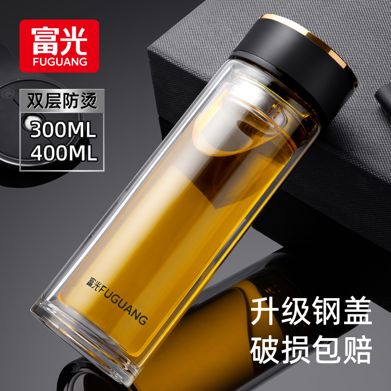 富光玻璃杯水杯男创意双层隔热印字便携随手杯子家用过滤透明茶杯