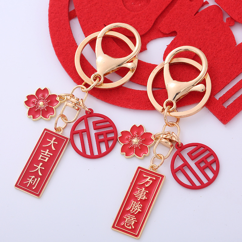 創意国風キーホルダーペンダント合金滴油小紅花円福字祝福語キーチェーンバッグペンダント