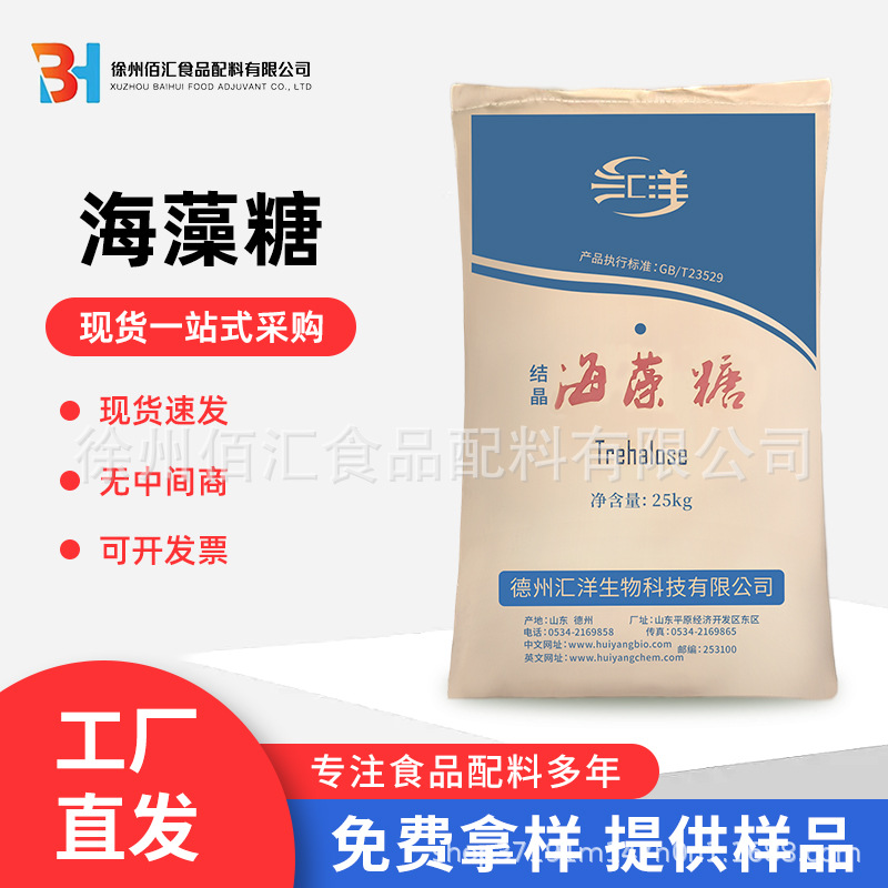 用途:甜度为砂糖之45%,防止淀粉老化 ,防止蛋白质变性 海藻糖是天然双糖中稳定的糖,即使在100℃、pH3.0条件下加热30分钟也不会着色、分解。