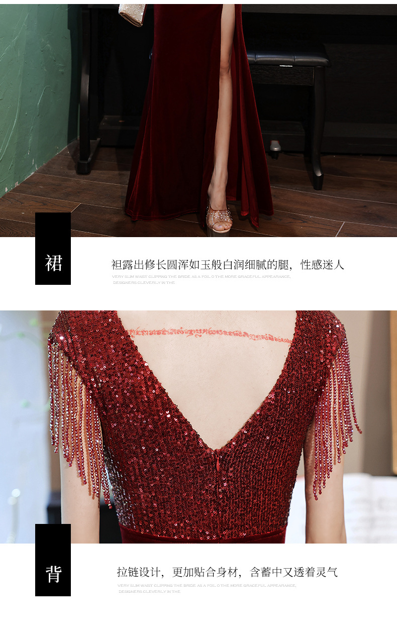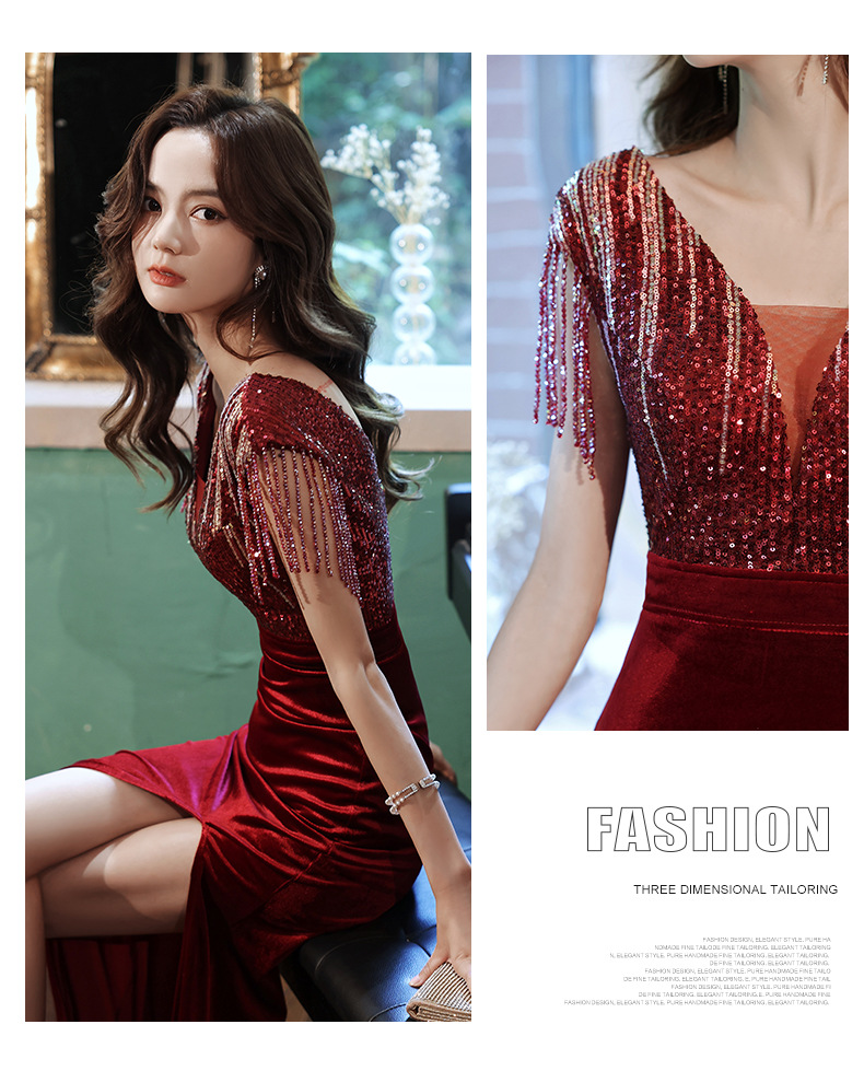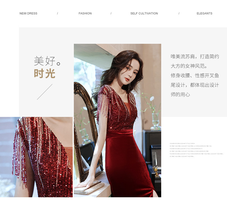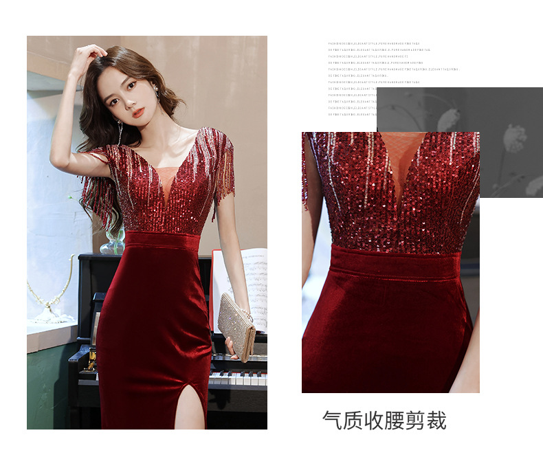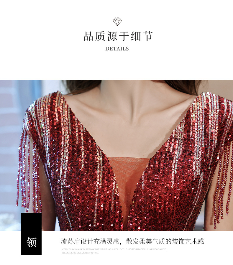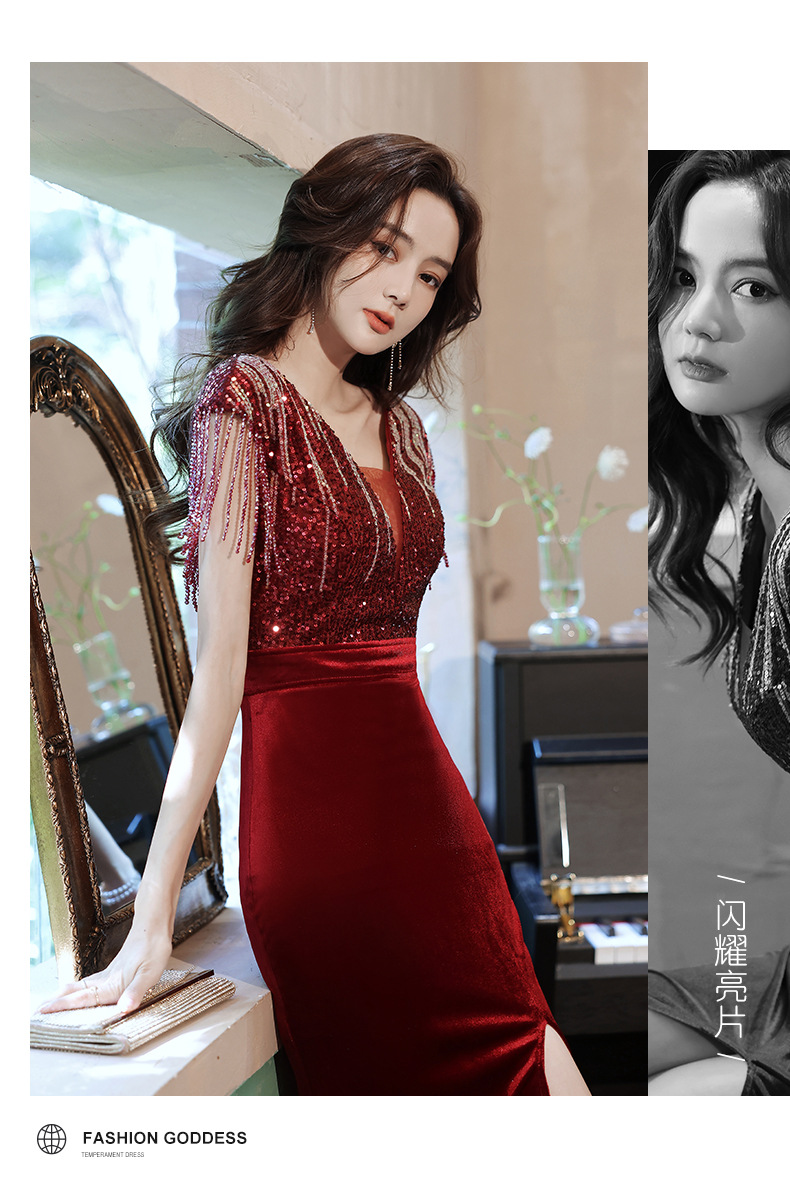 スパンコール付き宴会ドレス2025新作フィッシュテールロング丈おしゃれ着痩せ効果上品司会者風ネットセレブ同型イブニングドレス