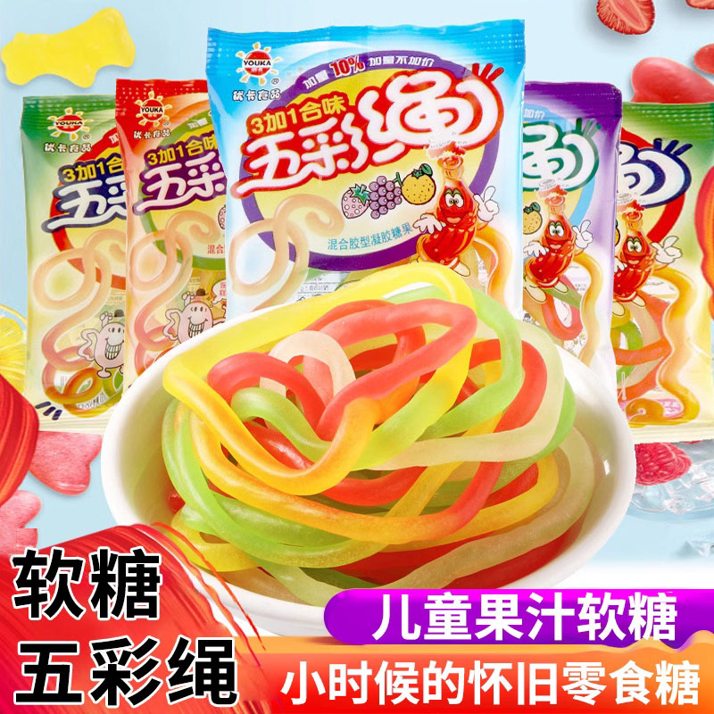 优卡五彩绳软糖面条糖彩虹跳跳绳糖橡皮糖Q糖皮筋儿童怀旧小零食
