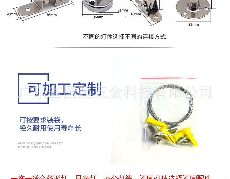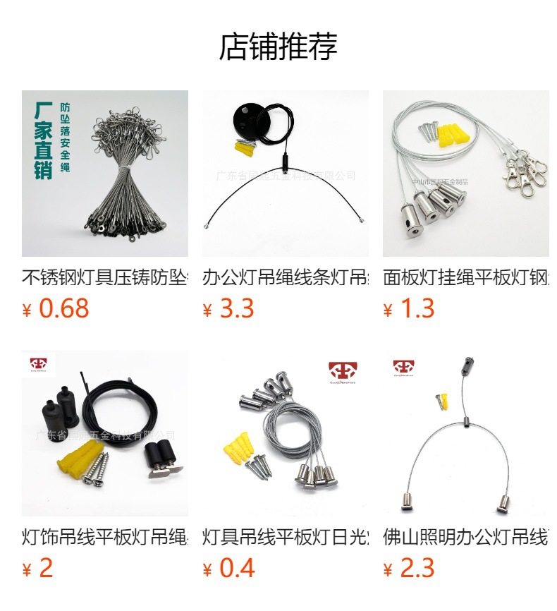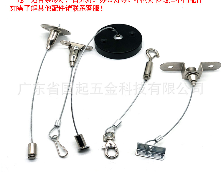 吊线类:一拖一款吊线,适用于面板灯,办公灯,铝型材,日光灯等吊装,线长可根据要求定义,锁线器可选铜或是铁件,产品种类多样 配件可按需搭配,如不懂怎么搭配请把灯具背面图片拍照咨询客服!