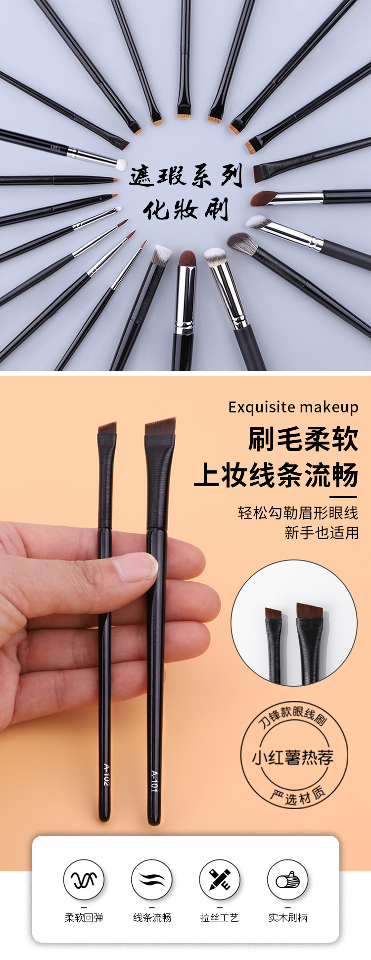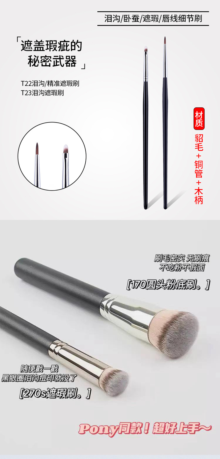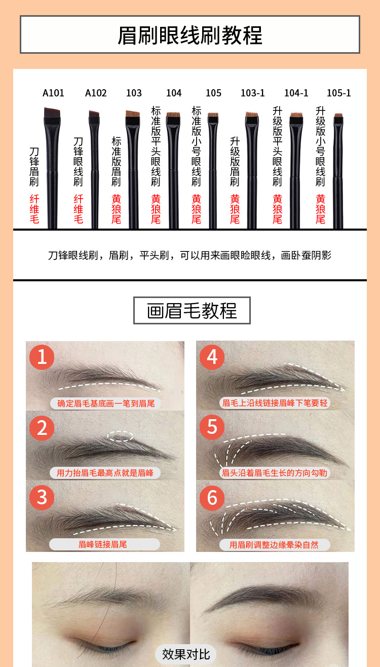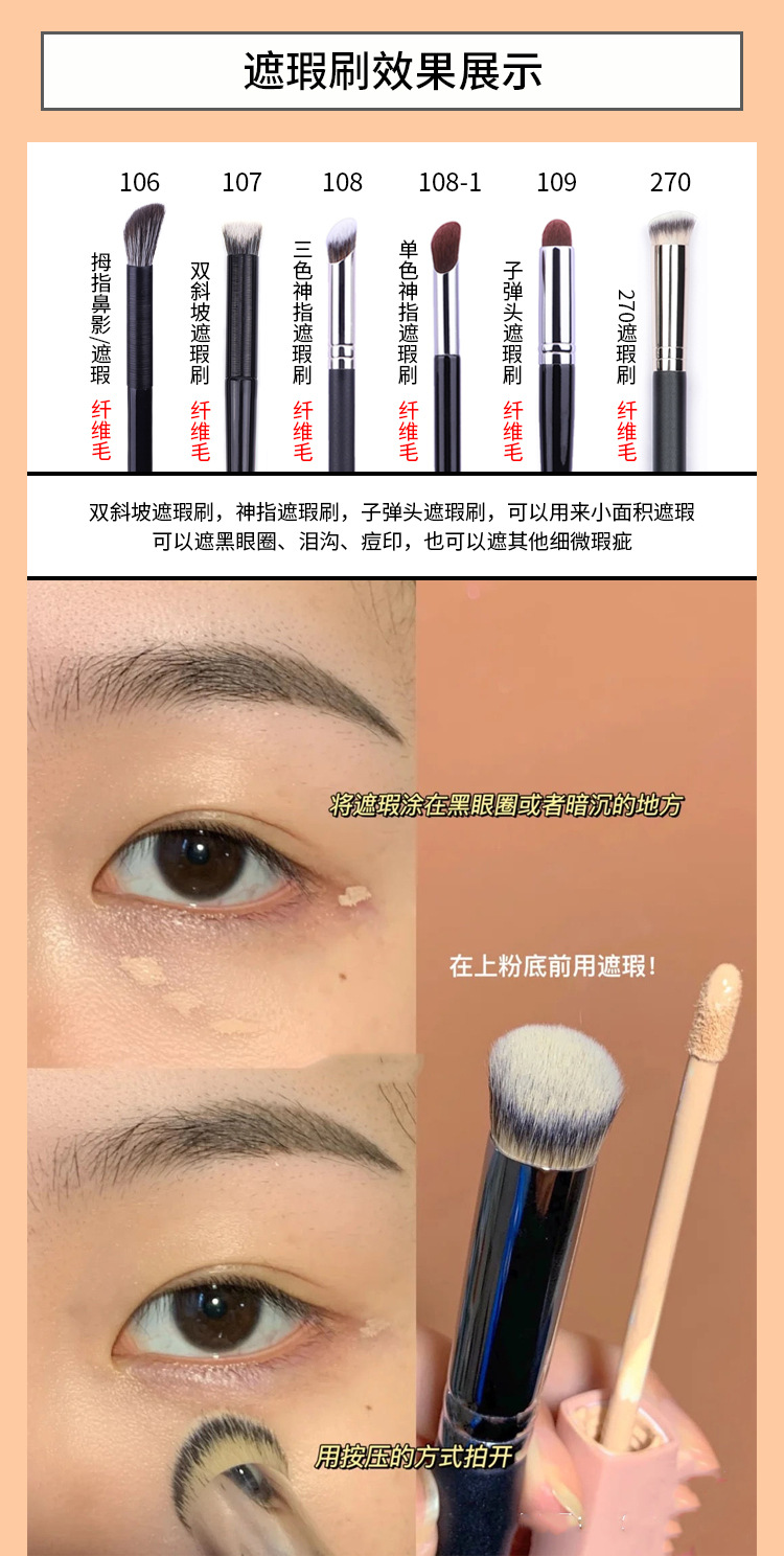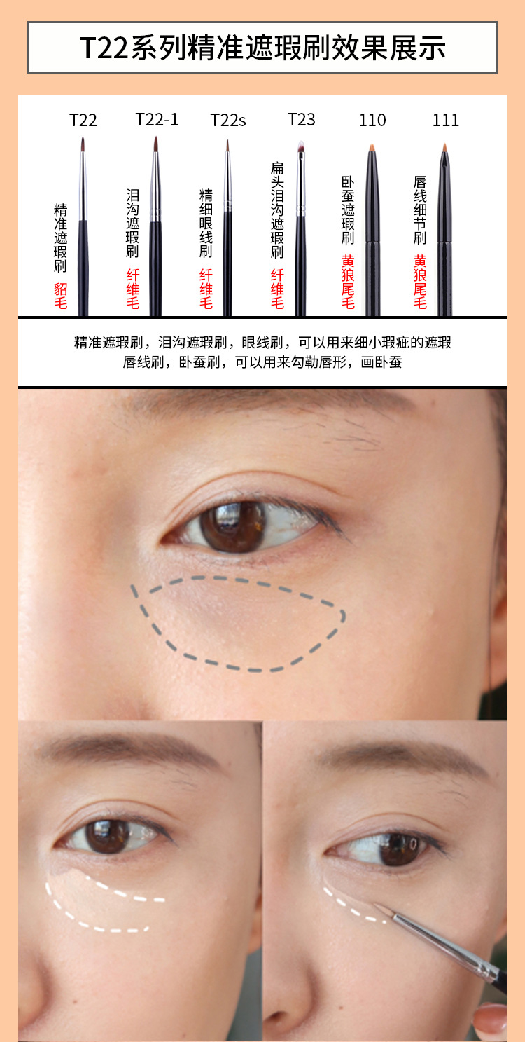外観カラー A101ブレード眉ブラシ,A102ブレードアイライナー,103標準版眉毛ブラシ,104標準版フラットアイライナーブラシ,105標準版小型アイライナー,103-1アップグレード版眉毛ブラシ,104-1アップグレード版平頭アイライナーブラシ,105-1アップグレード版トランペットアイライナー,106親指鼻影/コンシーラーブラシ,107ダブルスロープのシーラー,108三色神指ブラシ,108-1単色の神はブラシを指します。,109弾丸ヘッドのコンシーラー,110臥蚕コンシーラーブラシ,111リップラインディテールブラシ,270小面積コンシーラーブラシ,T22精密コンシーラー,T22-1涙溝コンシーラー,T22-s線引きブラシ印字,T22-sミンクのアイラインは印字されていません,T23平頭涙溝カバーブラシ (銅管),T301アルミチューブスポンジダブルヘッドコンシーラーブラシ,106-2炎のぼかしブラシ,T23フラットヘッド涙溝コンシーラーブラシ (アルミチューブ)