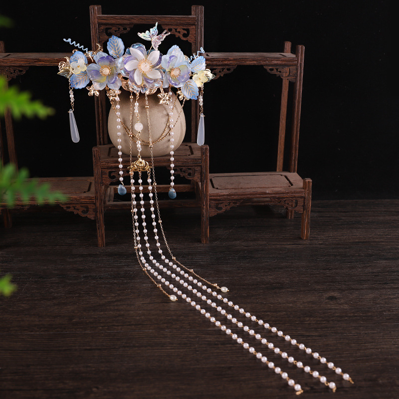 2024新古風オリジナル手作り瑠璃花びら超仙少女長流蘇歩揺韓式怠け者漢服カチューシャ