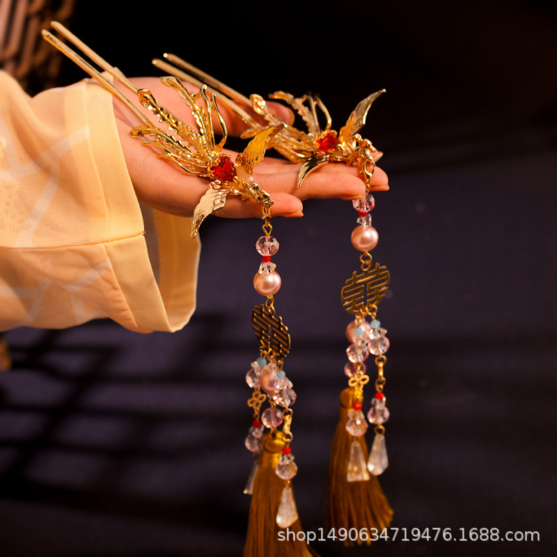 新しい時代の漢服の金色の鳳凰は結婚して乾杯します。