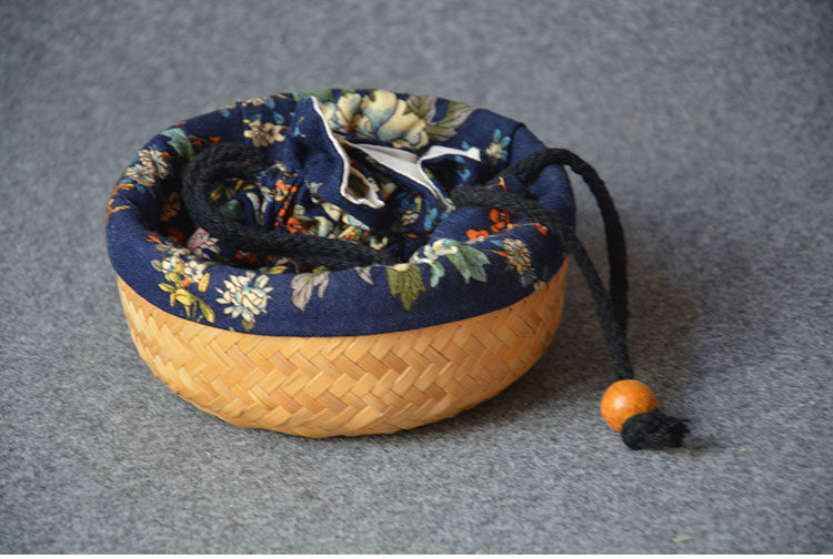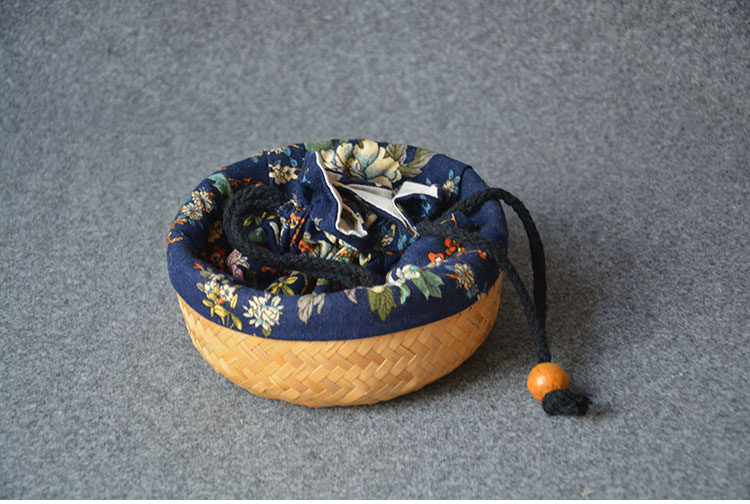 藏青布袋盒:直立整体高21CM,抽绳束口处距底部16.5CM,盒子直径10CM