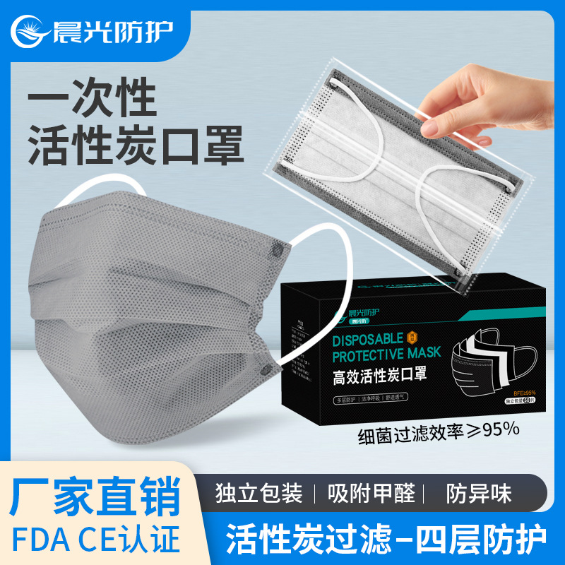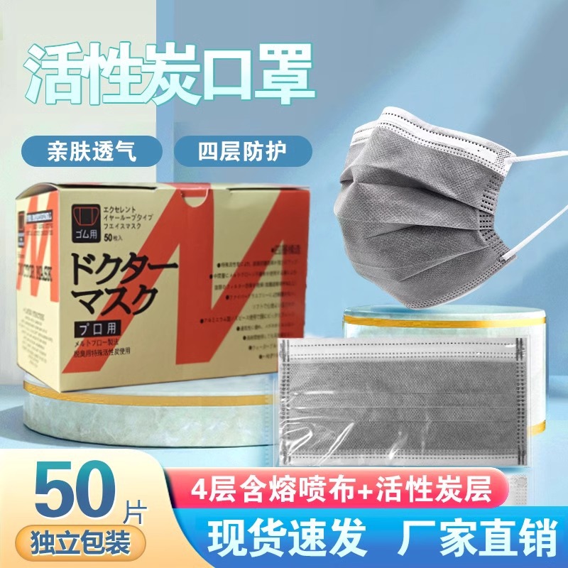 活性炭マスク4層構造、使い捨て、防塵・防煙霧、グレー・ブラック、個別包装、メーカー卸売