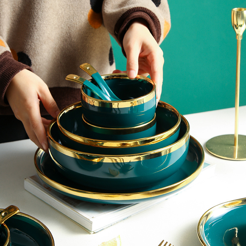 北欧网红餐具祖母绿墨绿色金边陶瓷米饭碗汤碗西餐厅牛排盘圆盘碟