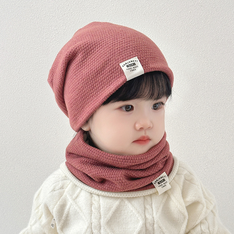 儿童帽子围脖两件套装男女童布标可翻边戴套头帽宝宝保暖防风脖套