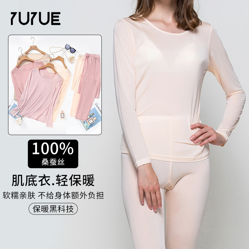 Yuyue 越境マルベリーシルク女性用サーマル下着シルクシームレス秋服長袖ワンピースドロップシッピングセット