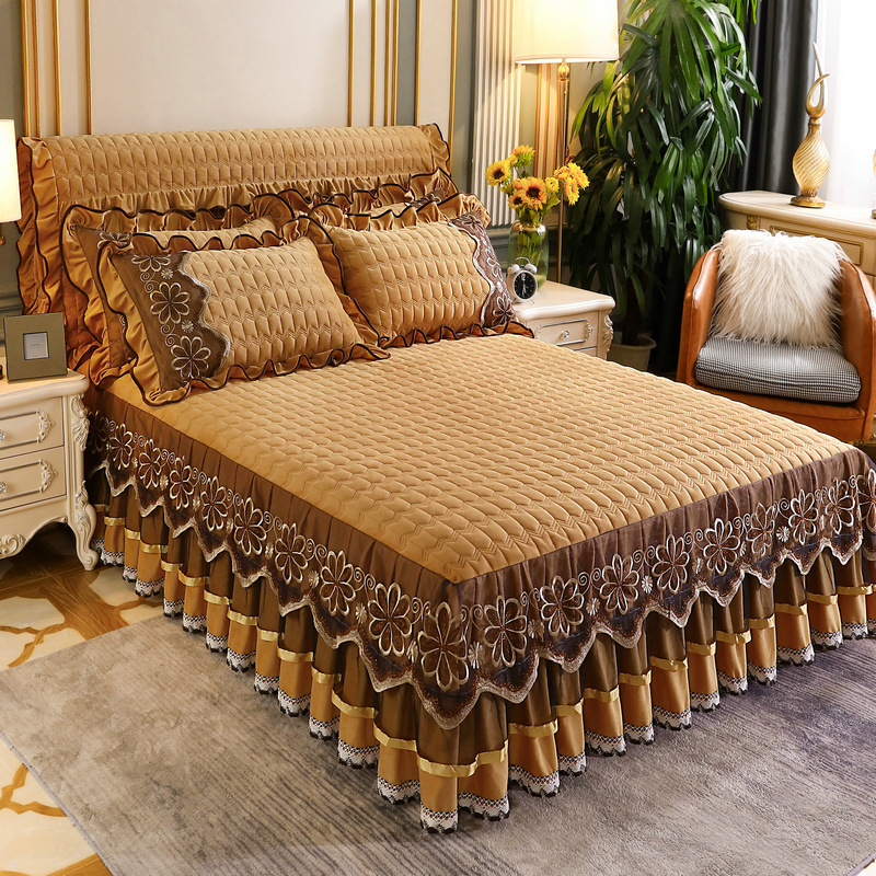 レースベッドスカート、ワンピースキルティングベッドスプレッド、オールシーズンベッドカバー、スカート付きベッドエプロン、3点セット