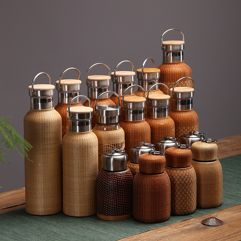 レトロ竹編みポータブルステンレス保温カップ籐編み旅行水カップ手作り軽蔑ポットケトル