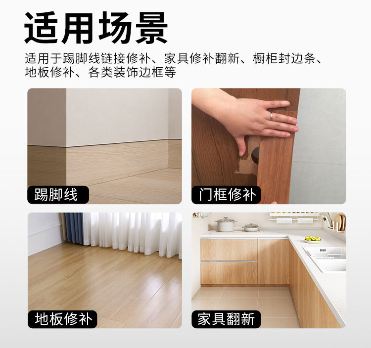 適用範囲 蹴り線リンク補修、家具補修リフォーム、戸棚シール、床補修、各種装飾枠など