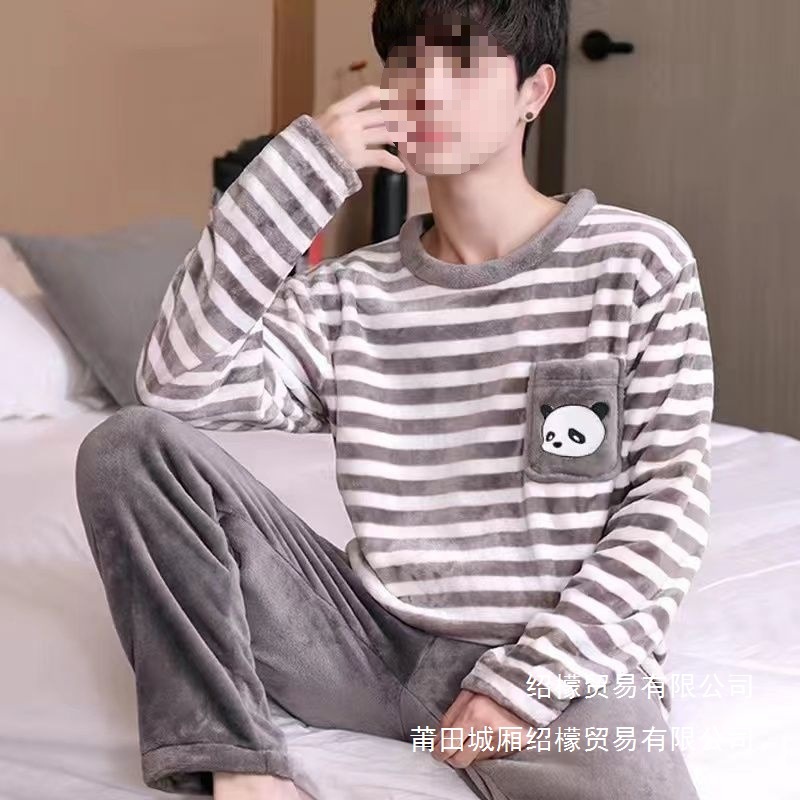 男士睡衣法兰绒睡衣男加厚新款珊瑚绒长袖保暖家居服套装跨境专供